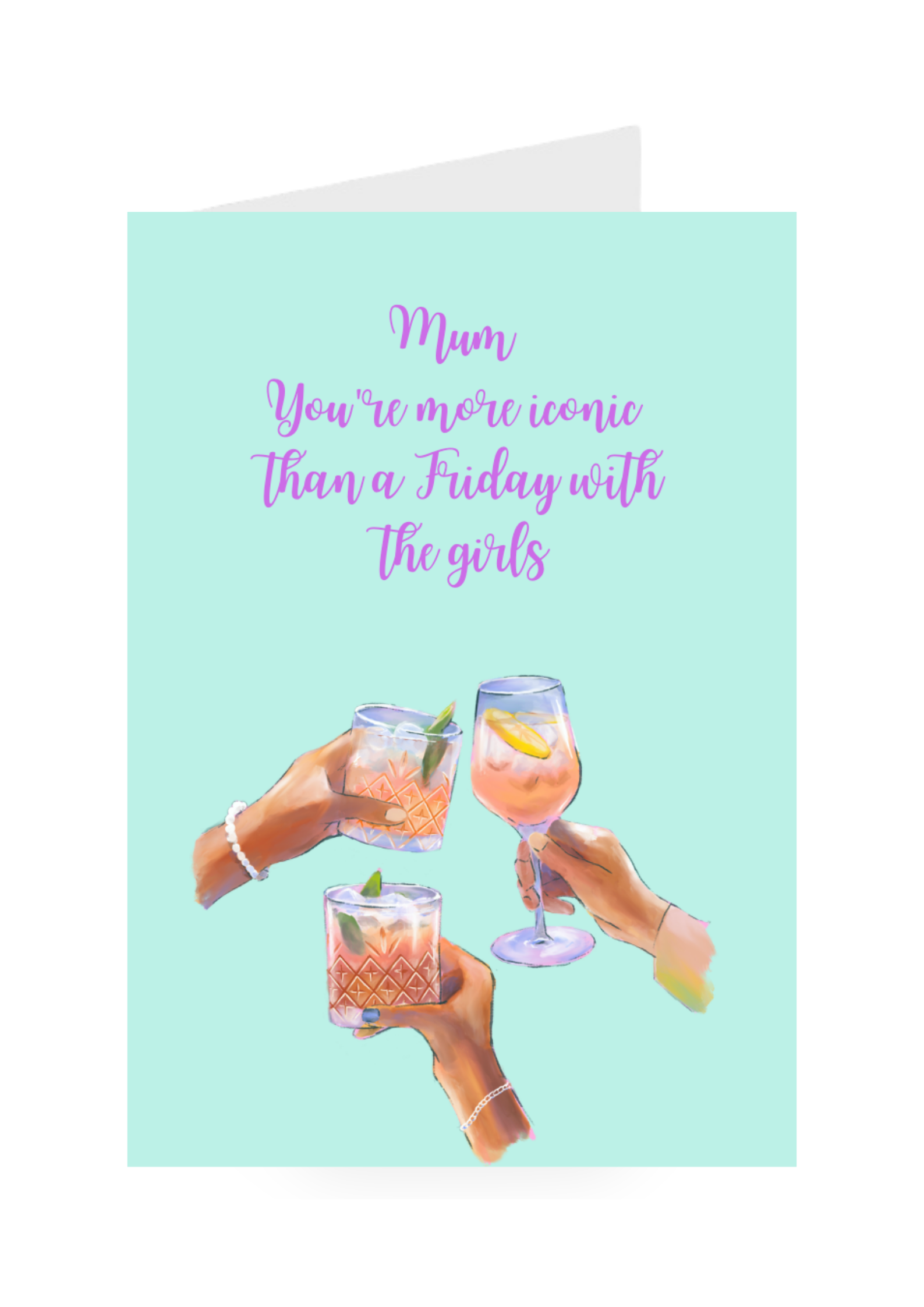 A5 Card, Blue background with purple writing and hands with glasses on the front, blank inside